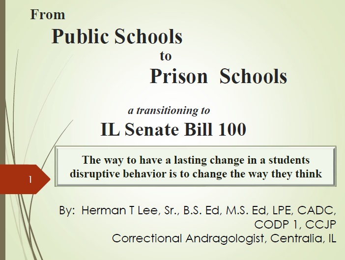 This presentation will provide school administrators, teachers, and correction’s personnel with basic background knowledge of the DSM and how emotional, behavioral and mental health problems can affect our children’s education. Under zero tolerance, suspension and expulsion from public schools, there is a systemic, subtle, implicit, cultural and personal bias towards these students with disabilities. Having an understanding that untreated disorders along with suspension and expulsion are major contributing factors to our increasing gang, drug abuse/ addiction and prison problems. Illinois Senate Bill 100 is attempting to address these problems.